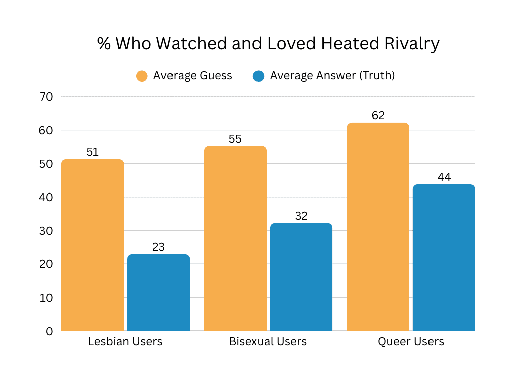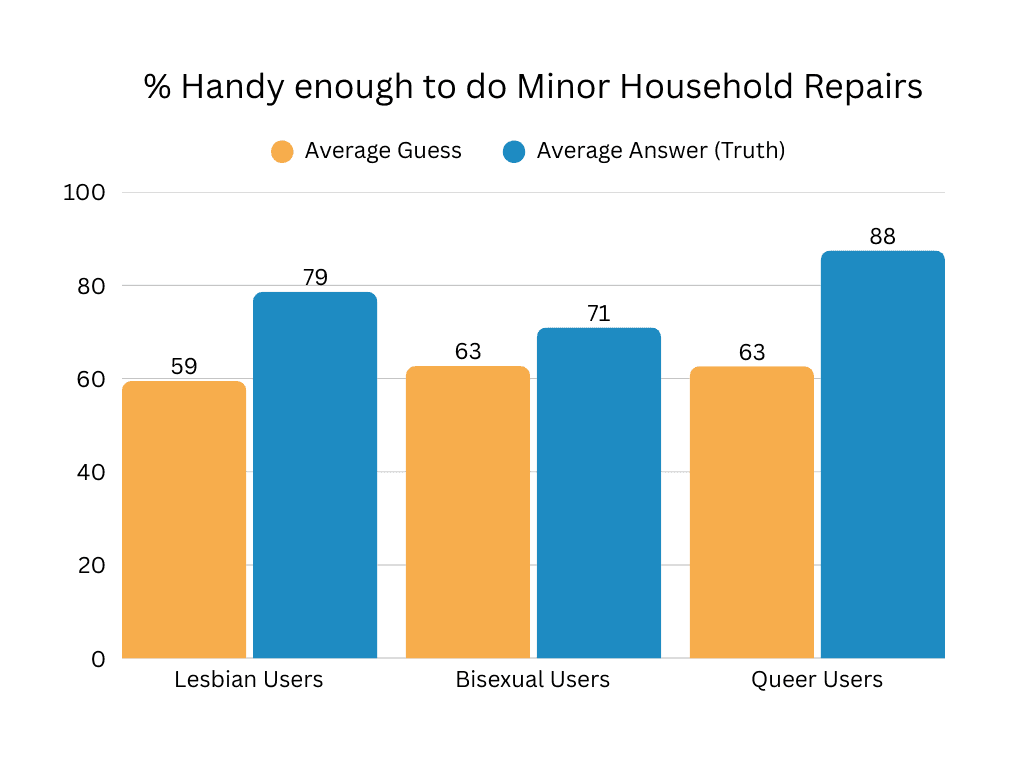 There were some differences for this by group, but I’m honestly still really pleasantly surprised by just how capable everyone is! It seems like you all are too, since the average guess was about 20% lower than the actual answer. Why is that? Is it because we, too, have internalized a narrative about women not usually being handy? Or did we think our paternal figure treating us kinda like a son sometimes was a unique experience? Either way, the indomitable DIY spirit of the wlw community is alive and well in our users! And trust that next time I need help on a repair, I will be dropping a question in our chat and relying on one of you handy mfs to tell me what to do. LBQGPT or whatever.