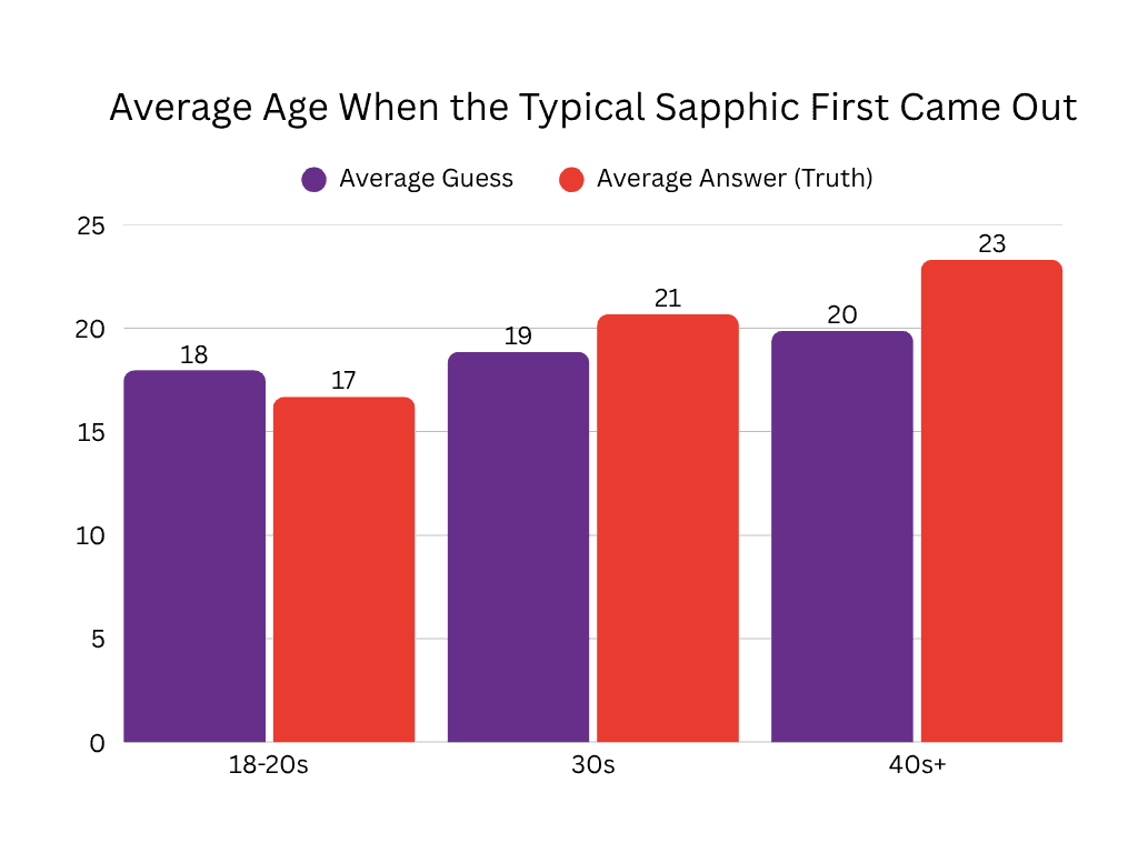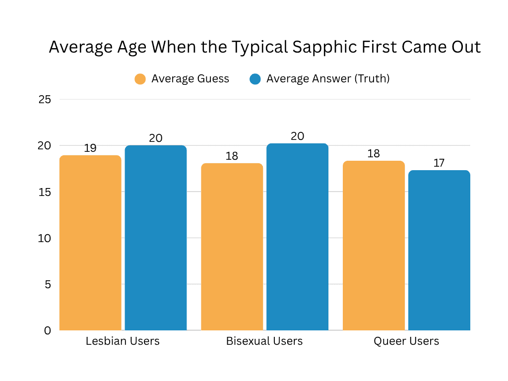 We saw an overall average at around 19 years old! Younger users demonstrated a lower age of coming out, and older users a slightly older age. I have a couple of thoughts as to why this might be. The first being that if you are a younger user on our app, then you figured it out early and so we see a lower average as a result. Older user groups will subsequently then include users who came out later in life and the results will reflect these experiences as well. The second is that there is less stigma about being sapphic now than previous decades, and so younger people may be more empowered to explore their sexuality and come out at a younger age than older generations. For that, we can thank the sapphics who came before us and fought for visibility and inclusivity, we have benefitted greatly from your efforts.