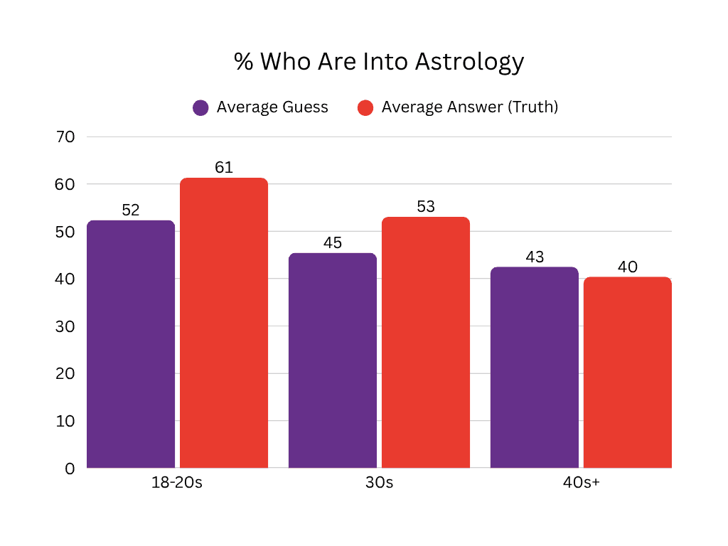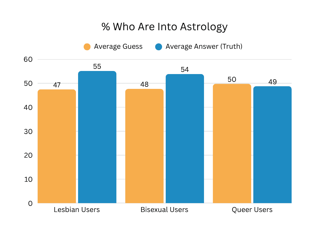 We didn’t see huge group differences by identity but queer users were slightly less into astrology! Funnily, the queer user group had the highest average guess though, so stereotype busted maybe? Or maybe just very accurate guessers! Ultimately though, the percentage of Americans in general who are into astrology is significantly lower than any of our user groups (a little under 30%), so maybe this stereotype is still true lol