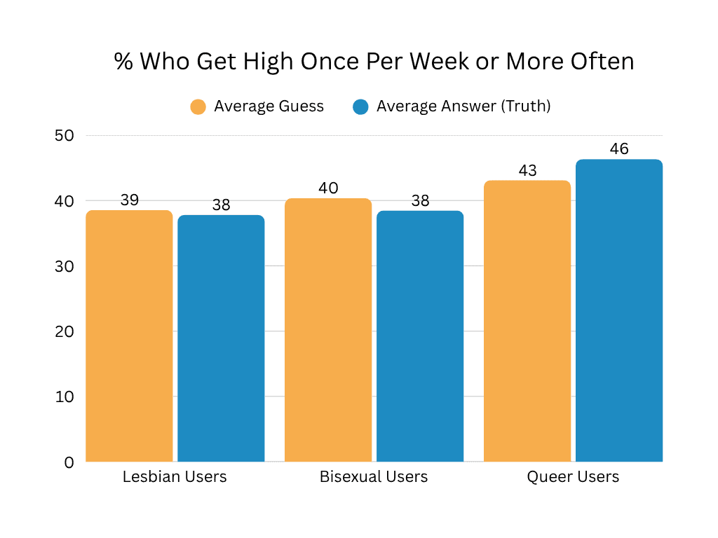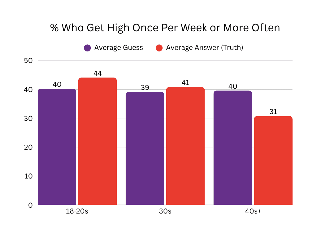 Across all users, we saw an average of about 40% who reported getting high at least once per week. Younger users had higher averages, with older users dropping about 10%. I was personally a little surprised at how high that number was (no pun intended), as it seems were many others since right around half of users guessed on the low side. We still saw of 60% of people not getting high at least once per week, so it’s okay if we’re not, uh, celebrating (?) today.