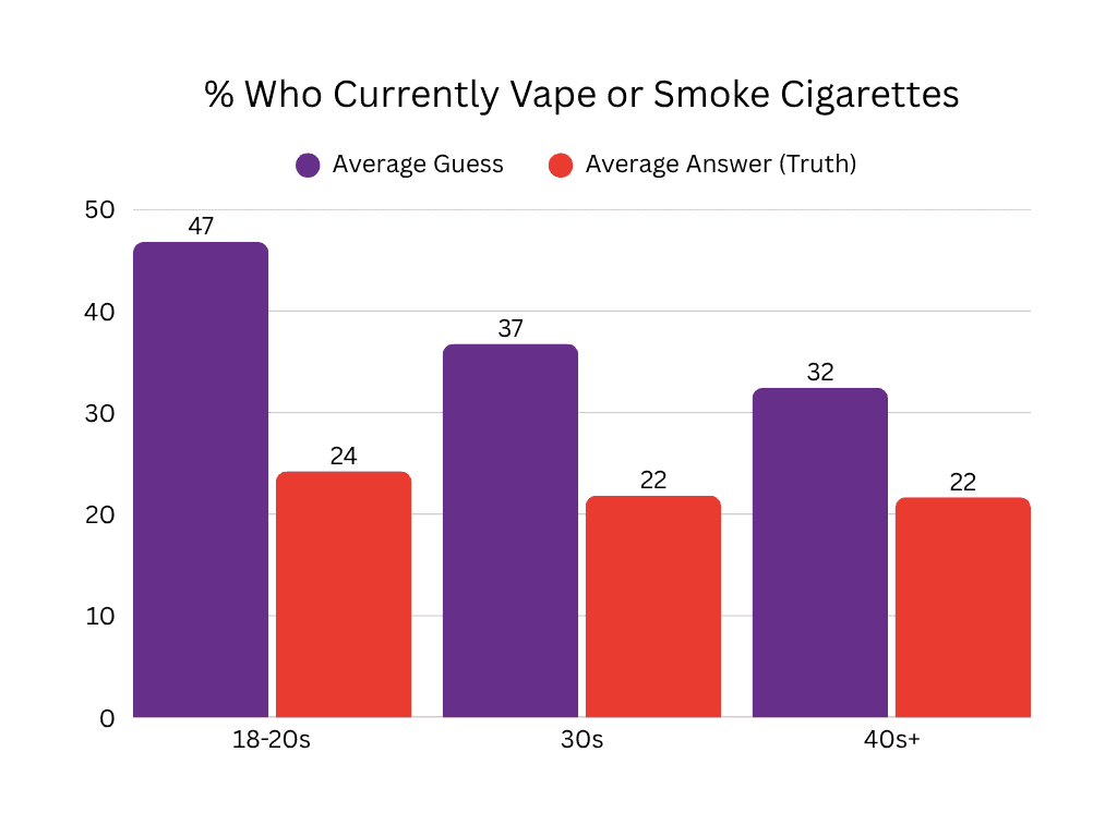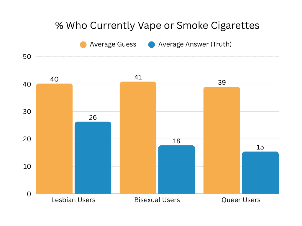 We saw pretty comparable levels of smoking across all age groups. But the perception that young people smoke was super high. For myself at least, I know I can attribute this to the bathrooms in high school where people were constantly smoking, it made it seem like this was very common behavior. I’ve also known a fair amount of sapphics who do smoke/vape as well, but apparently we fixate a little too much on the times we do see it and disregard the times we don’t!