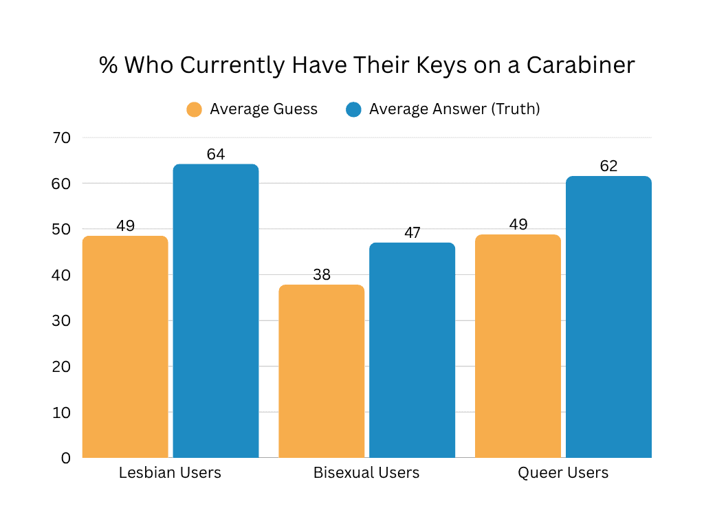 Lesbian and queer users reported similar levels of carabiner use, with bisexual users reporting over 15% lower on using the carabiner for their keys. Where do you put them instead? I guess I’ve been using mine for too long to not know where else I’d put them except on a belt loop. I’m being told this is where purses, bags, and pockets come in. I’m happy for you if you have reliable pockets like that.