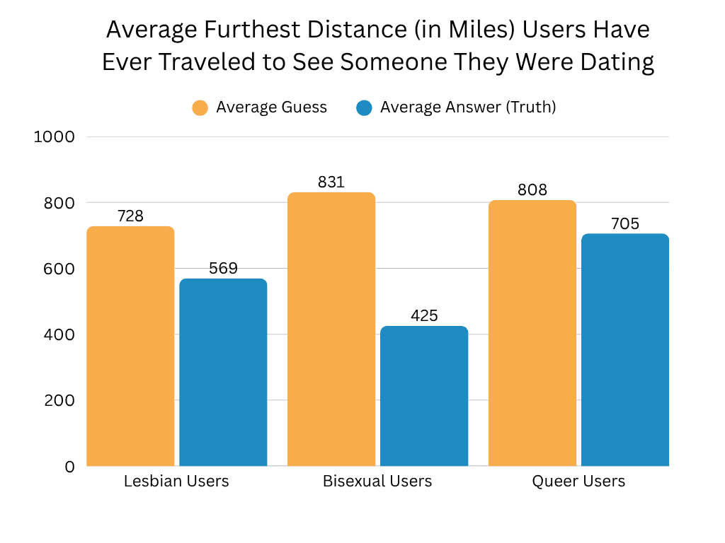 And I would drive 500 more! The average distance across the board that sapphics have reported traveling to visit someone they’re dating was 571 miles. That is roughly ⅕ the distance from LA to NY. That’s like driving the 405 seven times through. That’s one-quarter of the length of the Oregon Trail (hopefully without the death and dysentery). That’s a lot of miles. To the 0.1% of users who got this one dead-on (+/- 10 miles), how does it feel having your finger on the pulse of this community?
