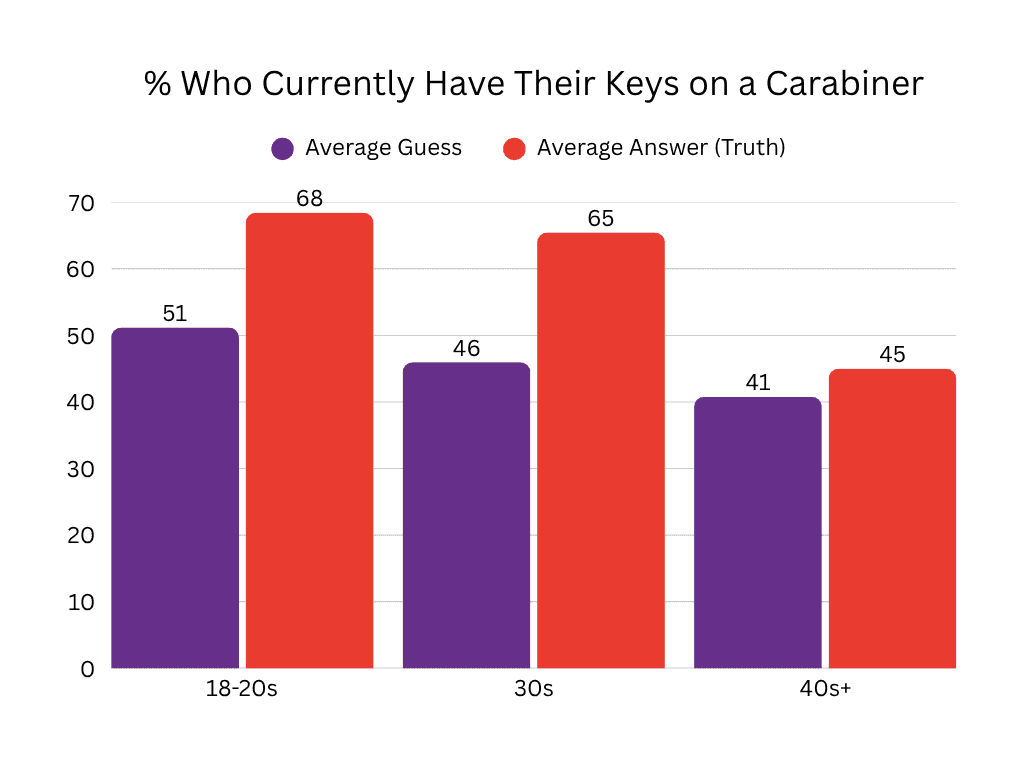 It turns out, a fair amount! It seems a little more prevalent in younger users than older users. I remember this making a resurgence several years ago on social media, and maybe it gained more popularity from younger crowds as a result. The guesses for this one were pretty low, people underestimated the popularity and utility of the beloved carabiner.