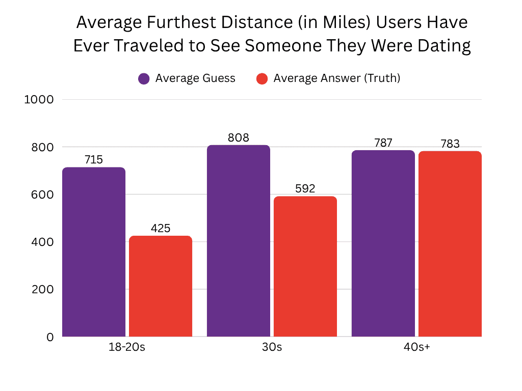 We had some fascinating group differences by identity though! Queer users reported a very romantic average of just over 700 miles and were also the most accurate in their guesses, only 100 miles off, give or take. But 100 miles is like nothing right?